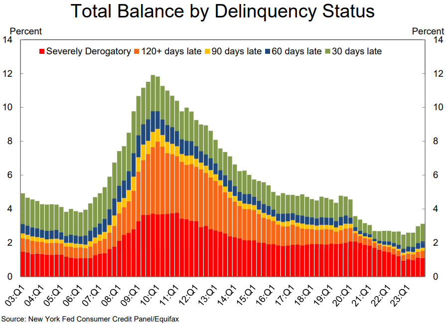 So, at least on the surface, these levels of debt aren’t a problem. Check out the delinquency status of all borrowings, including credit cards, auto loans, and mortgages. The percentage of balances that are in some stage of delinquency is only about half of what it was pre-COVID.