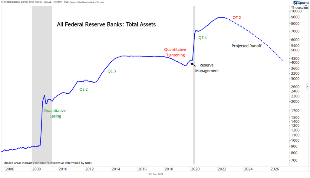 Increasing short-term interest rates isn’t the FOMC’s only tightening tool in action: in September, monthly rolloff caps for the Federal Reserve’s balance sheet increased to $60 billion for Treasuries and $35 billion for mortgage-backed securities. At $95 billion per month, the speed of maximum runoff is almost double the $50 billion pace implemented in 2017, our only previous experience with so-called quantitative tightening.