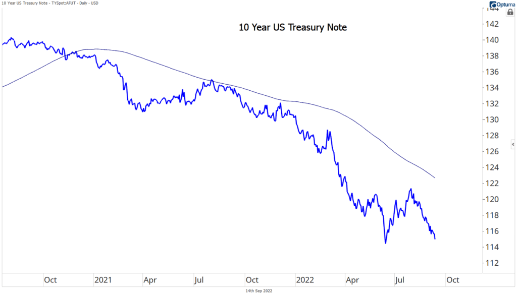 Bonds have not acted like a safe-haven for investors during the equity selloff, as the benchmark 10-year yield has doubled from 1.5% to more than 3.4% this year. That’s driven bond prices 14% lower over the course of the last 12 months – among the worst performances on record for a period of that length.