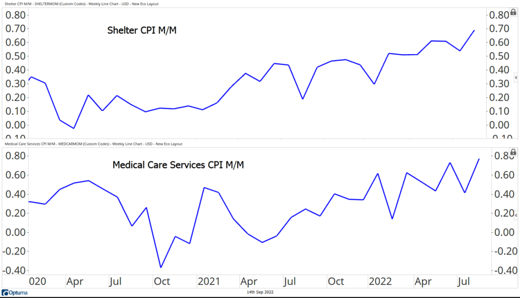 Prices continue to rise at a rapid pace, with the August CPI report coming in hotter than most economists had expected. Energy prices continued to fall, pushing the headline number down to 8.3% from July’s 8.5% reading. But core inflation, which strips out the volatile food and energy components and is supposed to be a better representation of the underlying trend, reaccelerated to 6.3% in last month. Housing costs are the primary culprit, as the monthly change in the shelter component of CPI rose to cycle highs. Prices for medical care services accelerated, too. Combined, the two make up half of the core CPI basket.