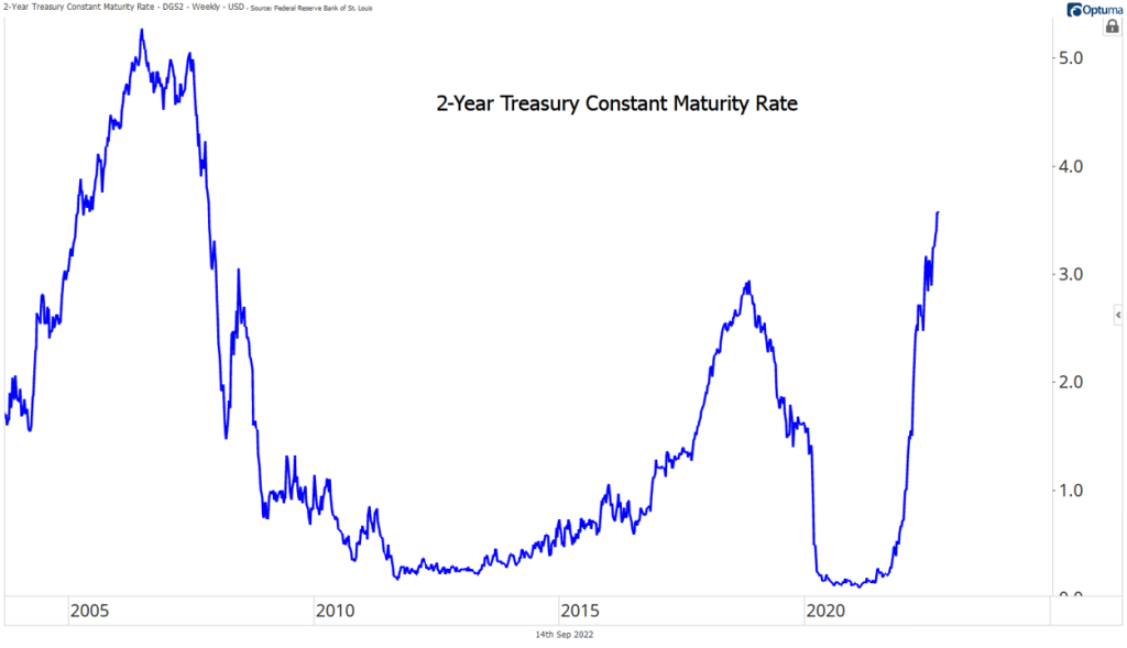 Just how elevated is still unknown. Fed officials widely agree that real rates need to rise above zero in order to be restrictive. With this week’s inflation report at 8.3% and rates likely at 3.25% after next week’s meeting, it seems more hikes lie ahead. The 2-year Treasury yield, which is a pretty good indicator for future rate hikes, has risen to its highest level since 2007.