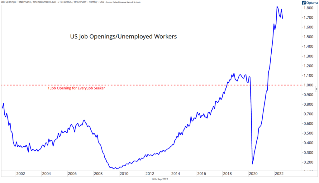 Now that inflation has returned, though, Philips curve believers are back. Two recent Fed studies – one from San Francisco and the other from New York – showed that wages and inflation have become increasingly linked. And according to ECB member Isabel Schnabel in a speech earlier this week, the slope of the Philips curve (e.g. the magnitude of relationship between its two variables) could be steeper when inflation runs hot. We could debate the merits of causation vs. correlation, and economists likely will for decades to come, but of this we can be sure: inflation is too high (just look at the chart above), and the labor market is tighter than ever. Nearly two jobs are available for every unemployed worker.