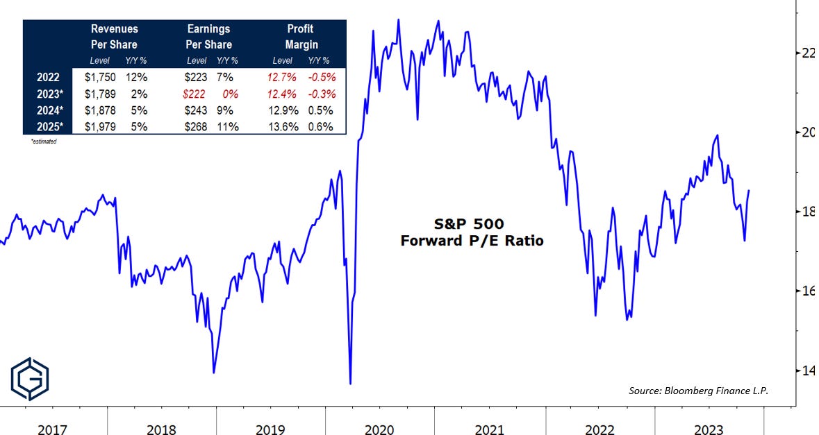 So far, 2023 has been the opposite experience: stock prices are up, but earnings are not. Profits began to stabilize in the most recent quarter after 3 consecutive periods of declines, but earnings projections for next year have started to deteriorate. With the market’s rebound over the last few weeks, valuations have climbed to roughly 18.5x next year’s earnings. That’s far from cheap when compared to historical norms.