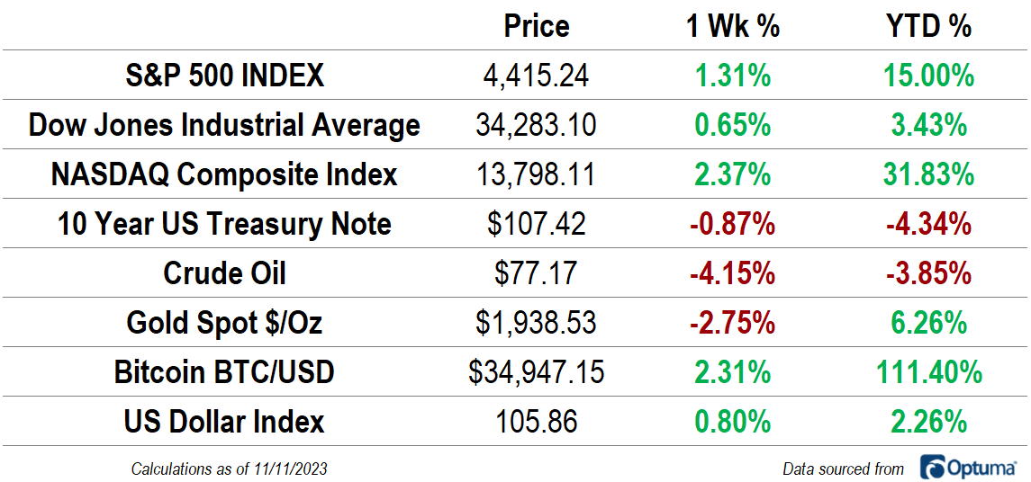 The S&P 500 rose for the second straight week and the NASDAQ Composite had its highest weekly close since September 1st. The NASDAQ’s rally pushed the index back above 30% for the year. The Dollar Index had its best week in 2 months as interest rates rose modestly, and that helped to drive a 4% decline in the price of crude oil and a 2.8% decline in the price of gold.
