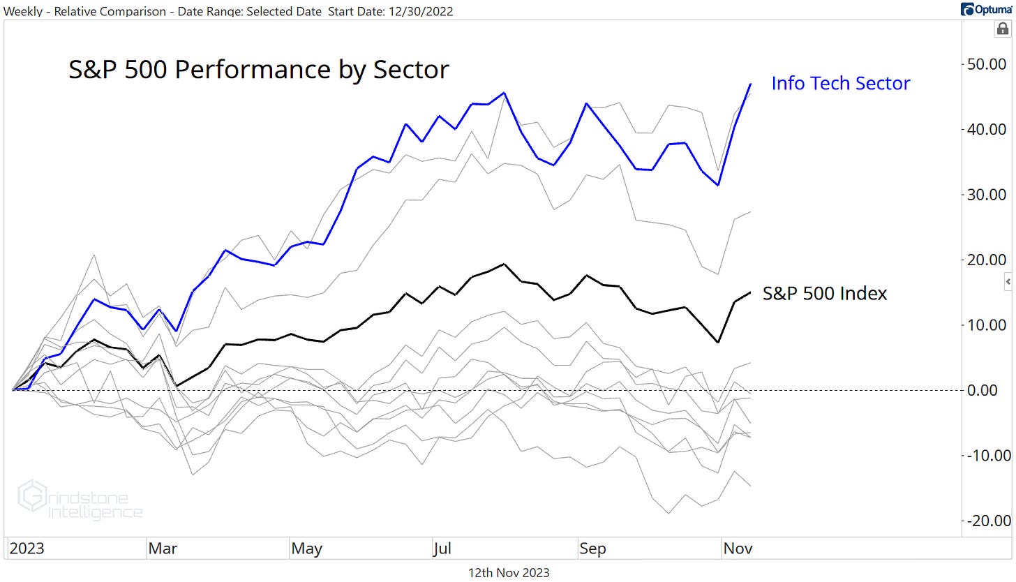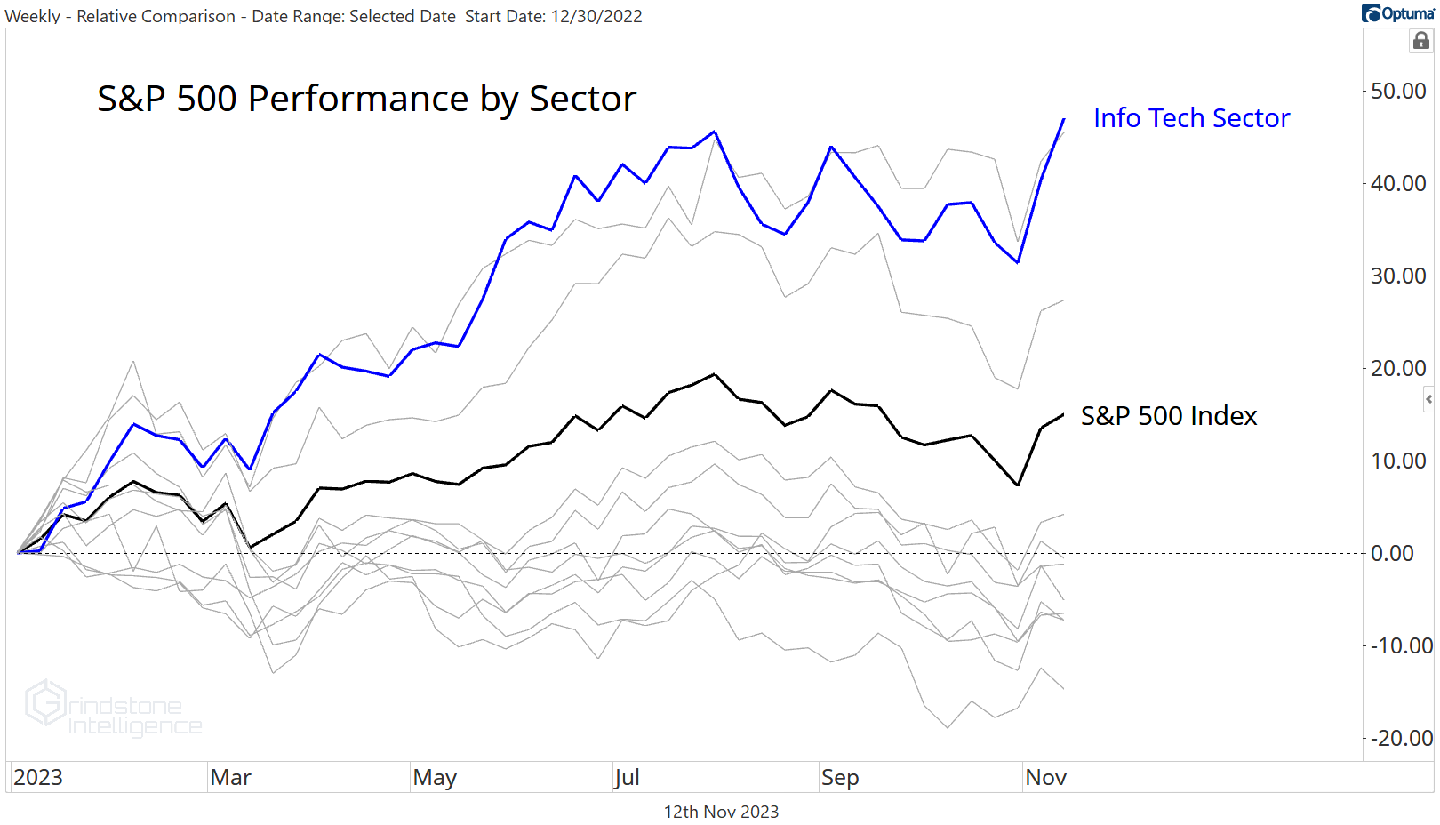 Tech is a risk-on sector that tends to be a leader during extended market rallies, so seeing Tech lead now implies that investors are discounting the likelihood of a renewed bear market. Still, it’s unusual to see such a distinct bifurcation in sector performance this late in the year.