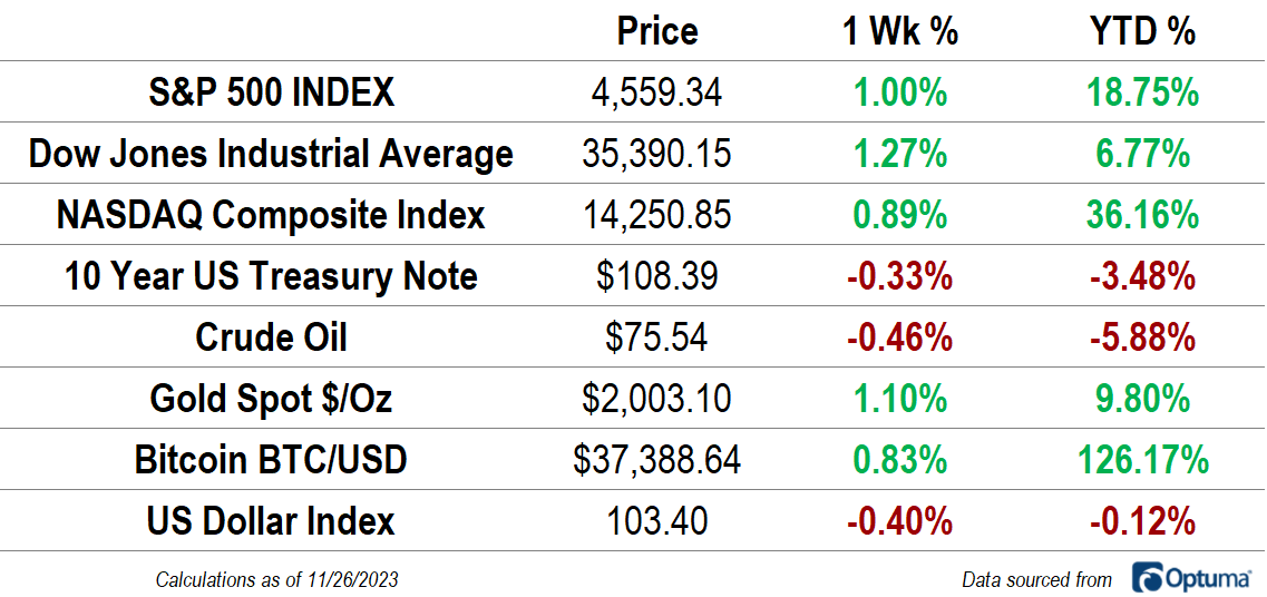 Another week, another big gain for stocks. That’s the fourth consecutive weekly gain of at least 1% for the S&P 500 and the second-highest weekly close since January of 2022. The NASDAQ Composite is now up 36% for the year, leading the major indexes. Gold prices rallied more than 1%, too, the fifth time in the last seven weeks that the yellow metal has gained at least that much. Crude oil, meanwhile, fell for the fifth straight week.