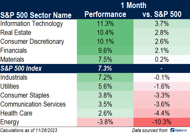 Only one S&P 500 sector fell over the last month, a 3.8% drop in the price of Energy stocks. Every other sector finished in the green, paced by an 11% gain for the Information Technology sector and 10% gains for both Real Estate and Consumer Discretionary. Risk-off sectors like Health Care, Consumer Staples, and Utilities all lagged the benchmark index.