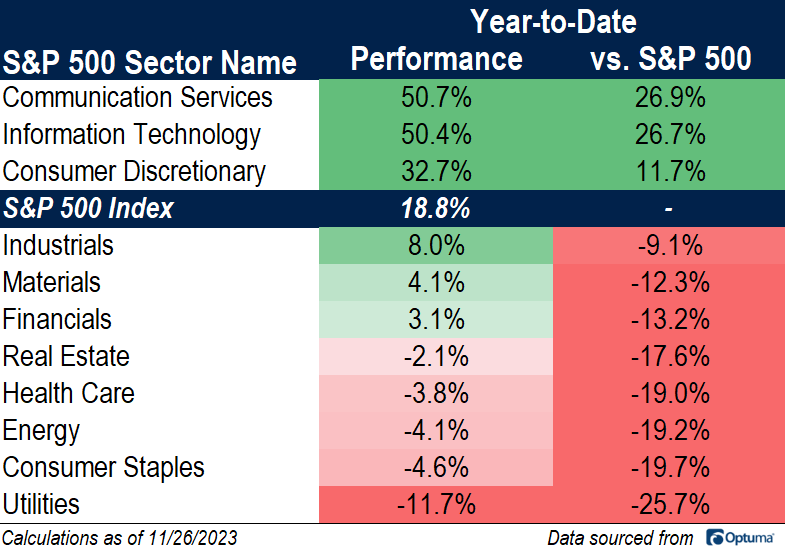 Growth sectors are still in the pole position year-to-date, with Communication Services (+50.7%), Information Technology (50.4%), and Consumer Discretionary 32.7%) each on pace for banner performances. The gains aren't widespread, though. Investing in any other sector has yielded a return for the year that’s well below the S&P 500's 18.8% gain.