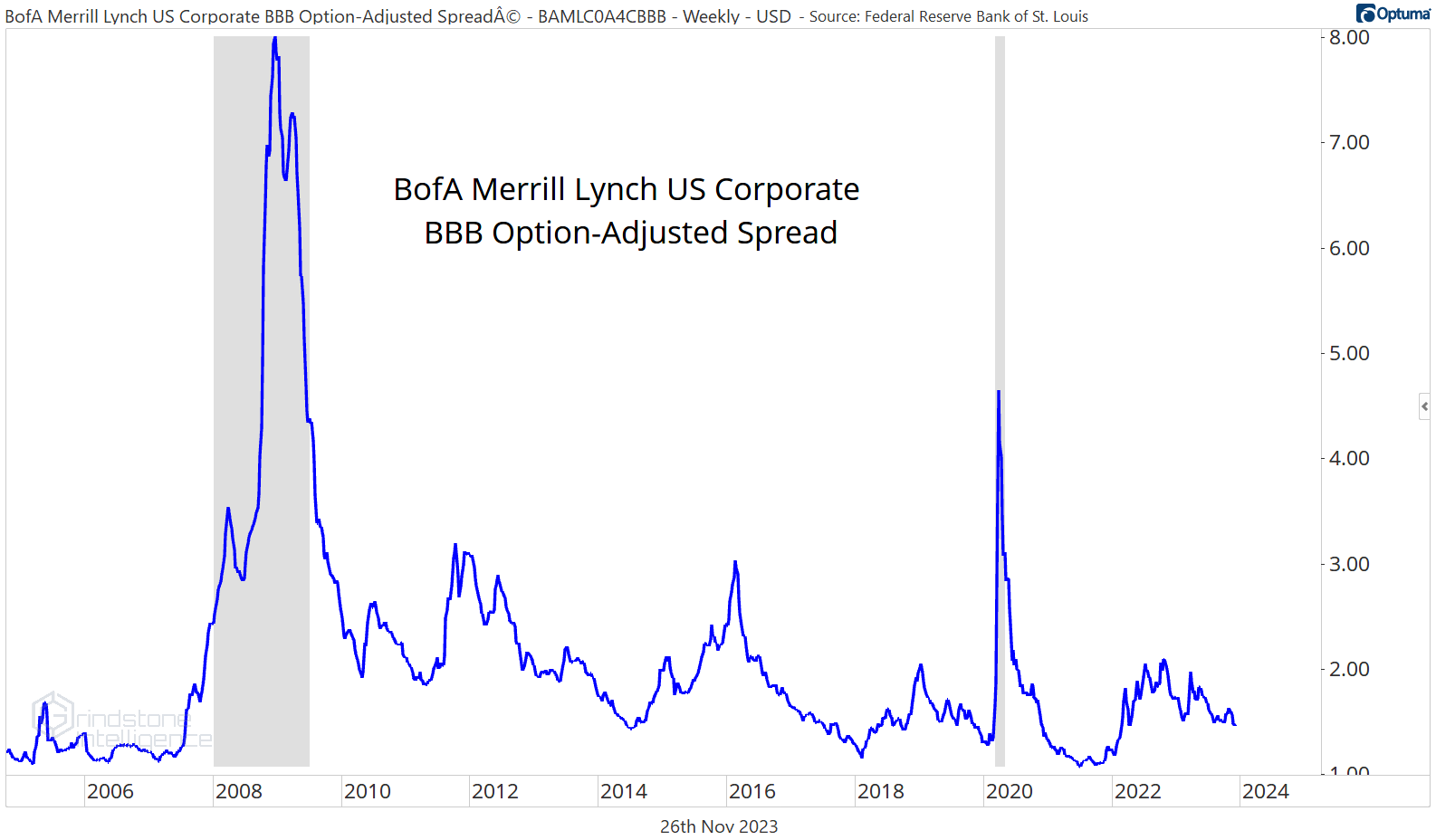 Much like it has all year, fear of imminent recession still permeates the investment landscape. There are plenty of reasons to be wary of an economic downturn, including a softening labor market, weakening consumer confidence, a manufacturing slowdown, and geopolitical uncertainties, to name a few. One thing not pointing to a recession is credit spreads. The interest rate premium that lenders require from riskier borrowers should rise as the economy weakens, since the probability of default rises during a recession. We’re not seeing that today, though. Instead, corporate credit spreads just hit their lowest level in a year-and-a-half.