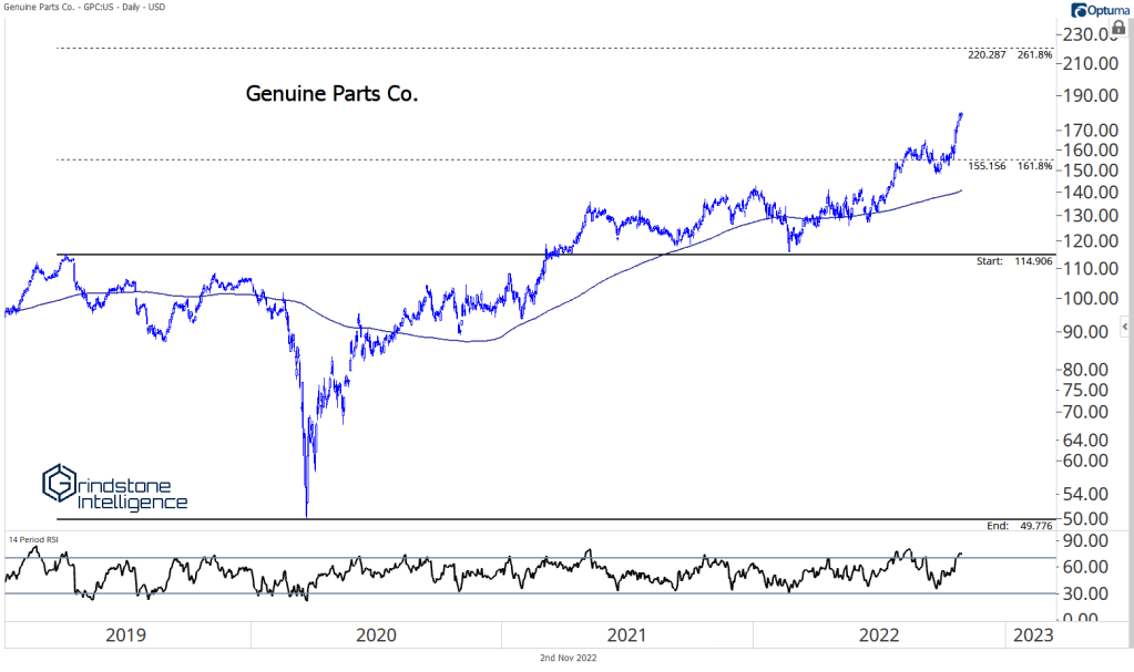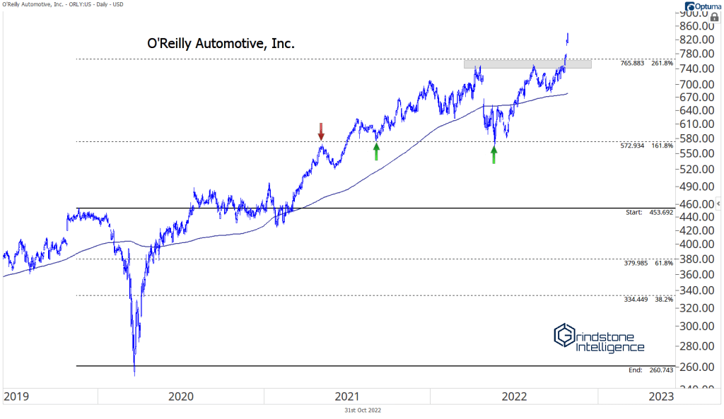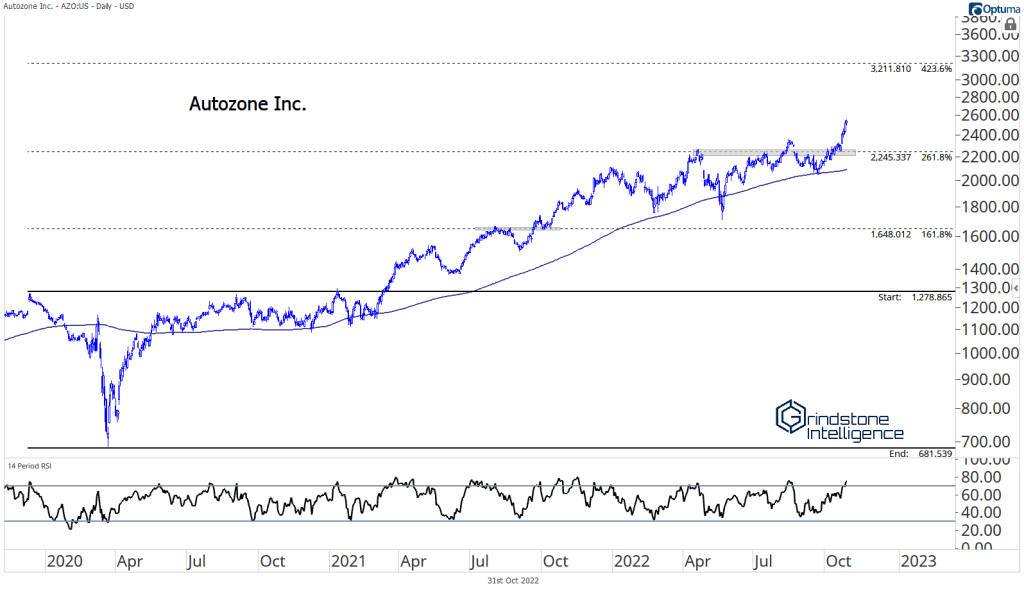 The other reason to be more constructive on the space is because of the relative strength shown by a lot of the underlying stocks. Auto parts retailers are ripping. Check out Autozone, O’Reilly, and Genuine Parts all setting new highs.