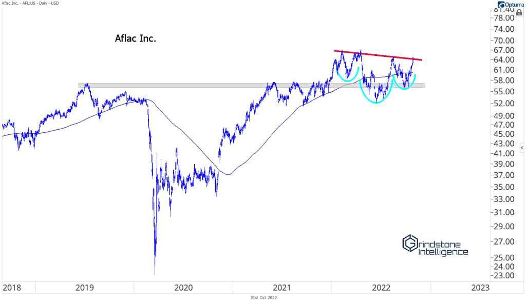 And here’s Aflac trying to break the neckline from an inverse head and shoulders continuation pattern.