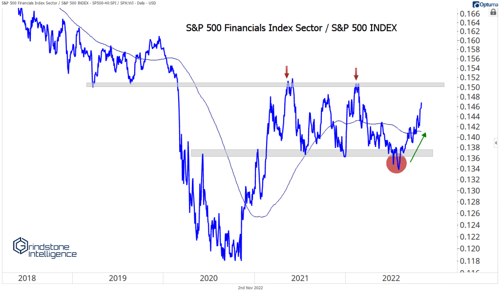 Financials are rangebound on a relative basis, despite a strong performance over the last few weeks. As long as the group is below the 2019 lows, we need to be cautious. Above that, though, and we want to look at getting aggressively overweight.