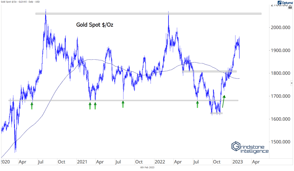 Commodity prices tend to be negatively correlated with the Dollar, and Dollar weakness has been a big tailwind for the rally that started in October. Just last week, it looked as though the DXY had even further to fall when it dropped below its 2020 peak and into the 5-year range that contained the index from 2016 to early-2022.