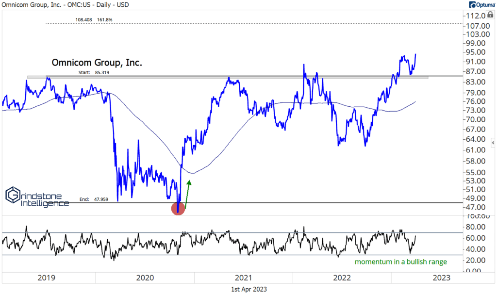 We don’t have to wait and see for Omnicom. OMC is a recurring guest on our sector outlook, and for good reason. It just set new 52-week highs again. Our target is still 108.
