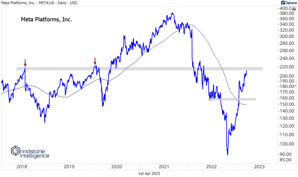 How much upside is left in the near-term depends on how the biggest stocks in the sector respond to major resistance. Meta is back to its 2018-2020 highs. It would be surprising if the stock just blew right past this level without a problem. The better question might be how much time it takes to absorb this overhead supply, and how far prices fall on any pullback.