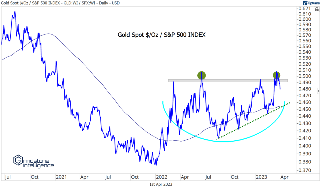 Relative to stocks, gold is working on a 12-month base that could set it up for an extended period of outperformance. The ratio has had a few false starts along the way, but its been all higher highs and higher lows since August. We’re on breakout watch.