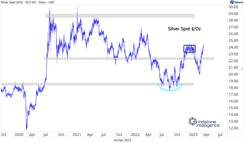 Silver surged back above 22.50, a key support level from 2021-2022, and it’s approaching new year-to-date highs. Back in December and January, we grew concerned about silver’s sideways trajectory while gold was rallying. Silver’s lack of participation caused us to turn cautious on precious metals ahead of the February selloff. We’ll see whether silver has the momentum to push through that congestion area this time around.