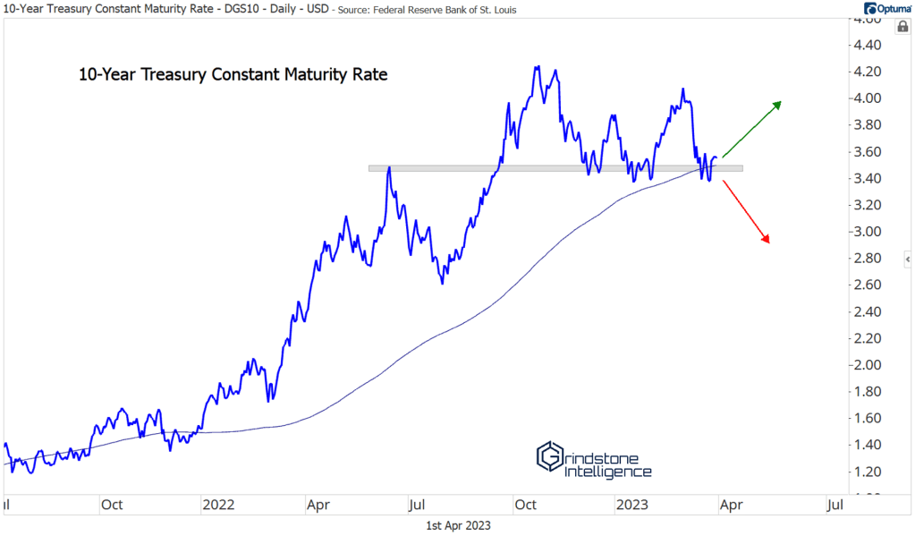 Speaking of interest rates, long-term Treasurys are looking for direction. Ten year yields have been dancing around 3.5% since last summer.