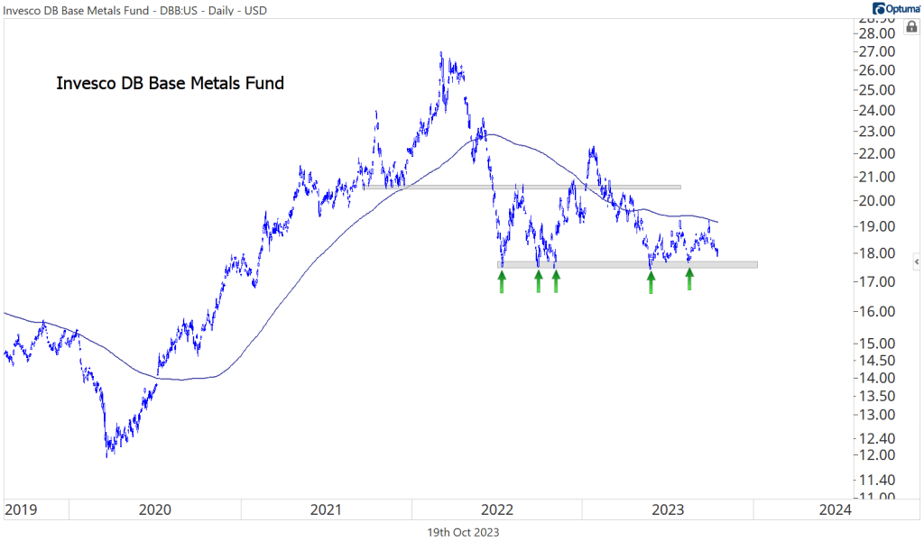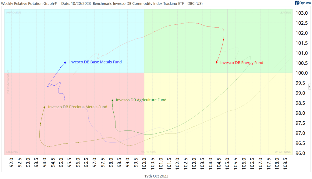 With crude rangebound, other commodities are trying to step up. The Invesco DB Energy Fund is still in the leading quadrant of the commodities Relative Rotation Graph, but base metals have climbed out of the lagging quadrant, and both agriculture and precious metals have turned higher.