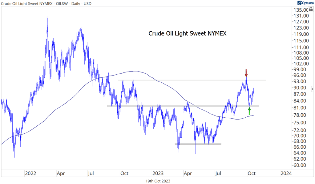 A sharp reversal in the price of crude oil is responsible for the shifting trend. After the bears failed to capitalize on breakdowns over the summer, the bulls took control and rallied prices from their lows in the mid-60s, past significant resistance at $82, and all the way above $90. For now, crude is stuck in the middle of a trading range between the spring highs of $82 and last fall’s swing highs near $95.