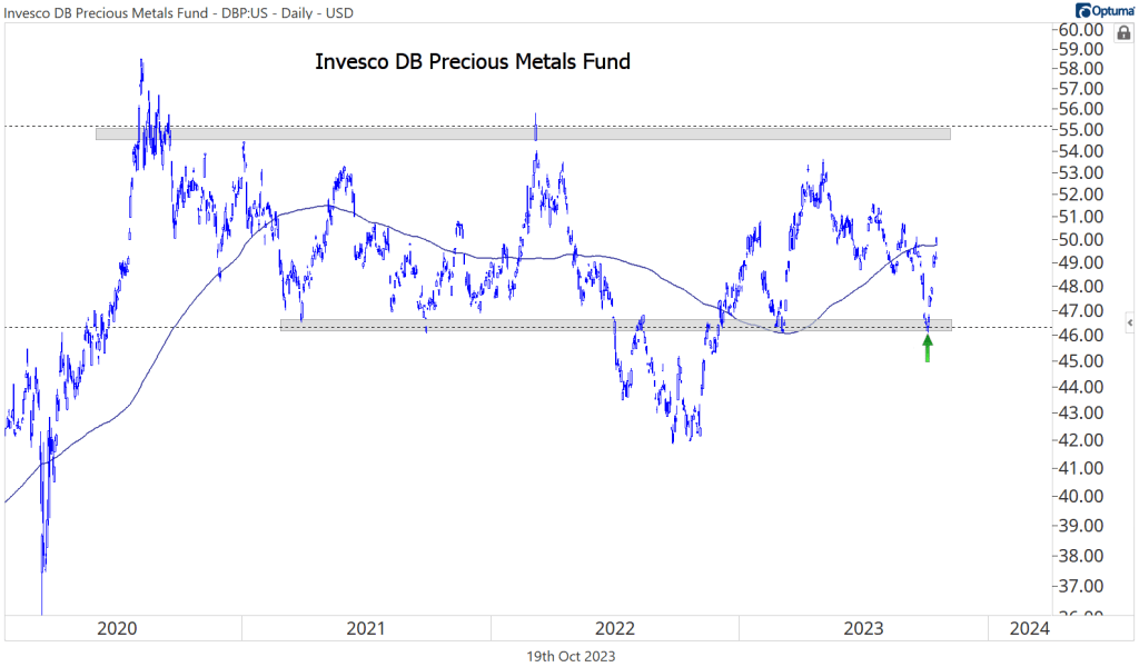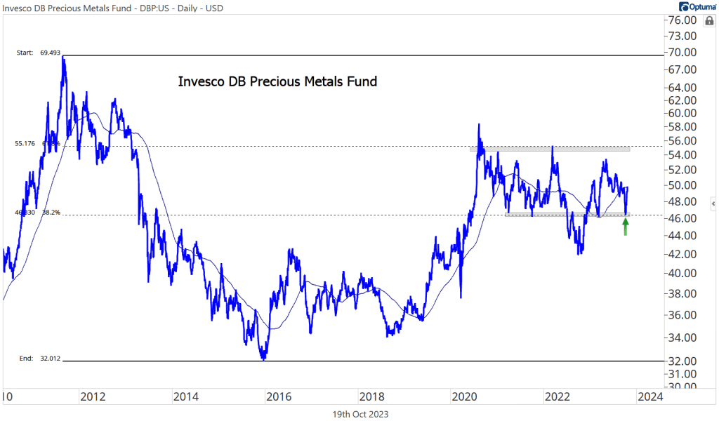 It’s not that precious metals are the worst place to be. In fact, they’ve held up rather well. Selling pressure at the end of September and in the first week of October pushed both gold and silver to their lowest levels since the spring, but buyers stepped in right when they needed to. Check out the Invesco DB Precious Metals Fund (DBP) finding support right where it needed to, at the 38.2% retracement from the entire 2011-2016 decline.
