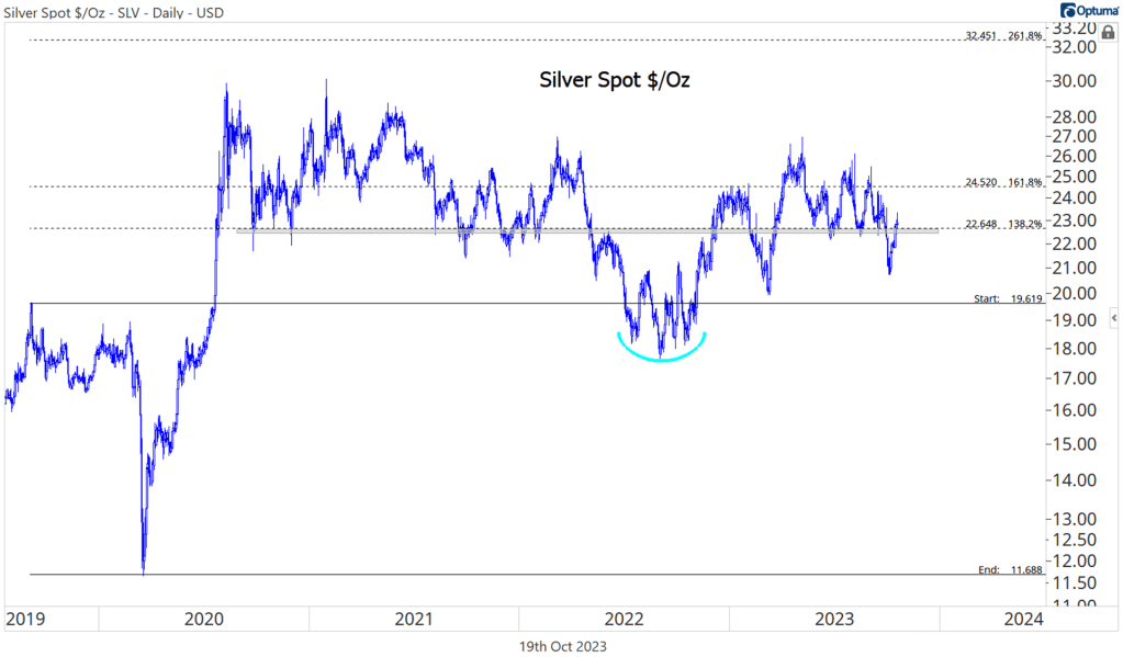 Silver has already jumped 10% since then. More importantly, though, it’s back above $22.50, which is the 138.2% Fibonacci retracement from the 2019-2020 decline and has also been a key rotational level for the past 3 years. We’d be more optimistic about silver’s future prospects if it can surpass $24.50, which is the 161.8% retracement. From there, we’d be targeting a move to $32.
