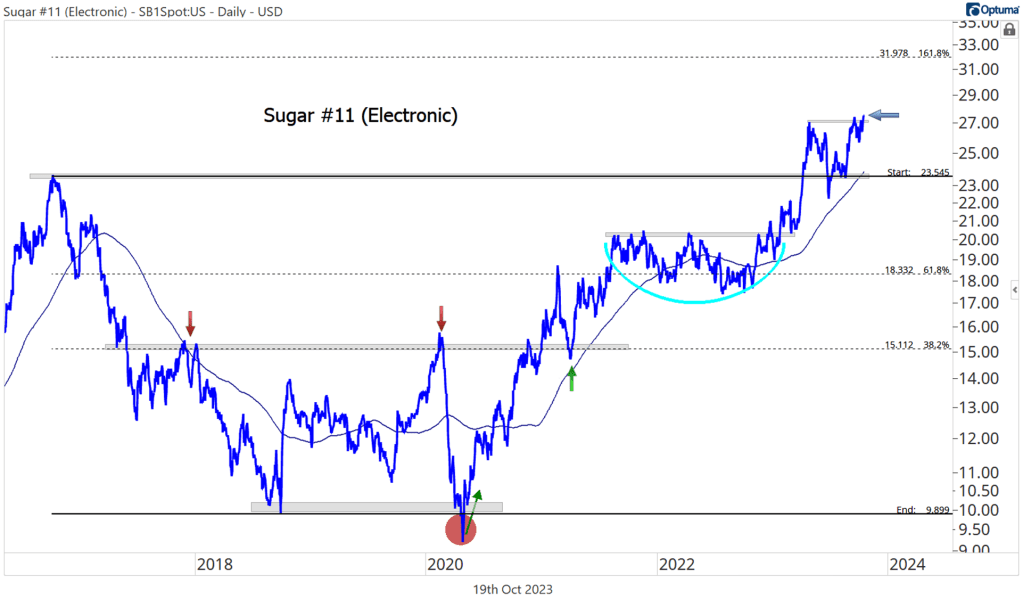 Orange juice is one that’s been tough to catch. It hasn’t had any meaningful pullbacks for buyers to step in, and we’re much closer to our target than we are to our risk level down at $280. Sugar offers a much cleaner setup. Sugar futures broke out of a huge base in the spring, but then stalled out near $27 before approaching our target $32. Prices have had 6 months to digest those gains, and they’ve been consolidating above their 2016 highs. Now, we’re getting a fresh breakout.