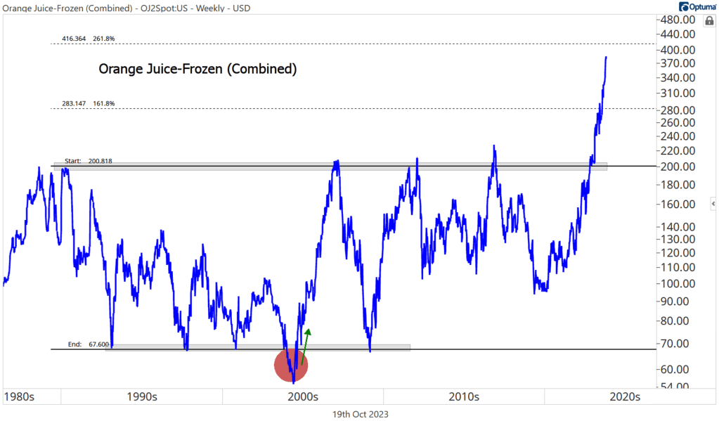 We acknowledged in July how crazy it was to be talking about a $400 target for OJ, but all it does is keep going up. That $400 target is the 261.8% retracement from the entire 1990-2020 range, and at this pace, we’ll be there by the end of the month.