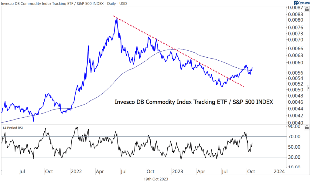 Stocks have been the place to be since last fall. There’s not much argument about that. Since equity prices peaked at the end of July, though, commodities have been leading the way. Check out the ratio of the Invesco DB Commodity Fund (DBC) vs. the S&P 500 below. We first broke the downtrend line, then momentum hit overbought territory for the first time all year. It’s too early to definitively call this the start of a new uptrend, but at the very least, this year-long downtrend has weakened considerably.