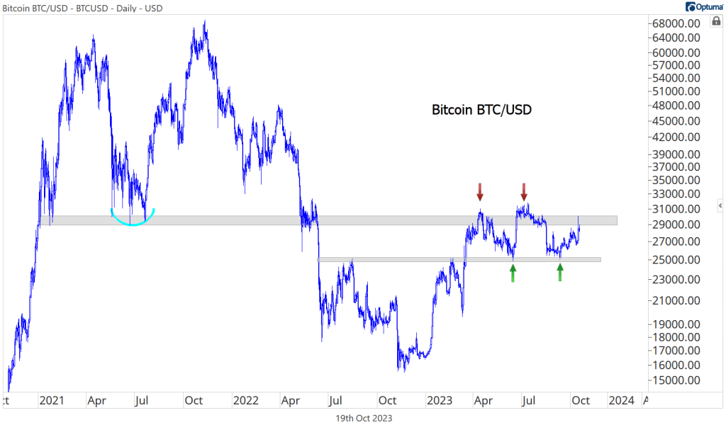 And we’ll end today’s note with Bitcoin, because it actually looks interesting for the first time in awhile. We’ve been consolidating above former resistance at 25,000 since March, and now we’re making another run at this still resistance level near 30,000. On a breakout, we want to be buying Bitcoin.
