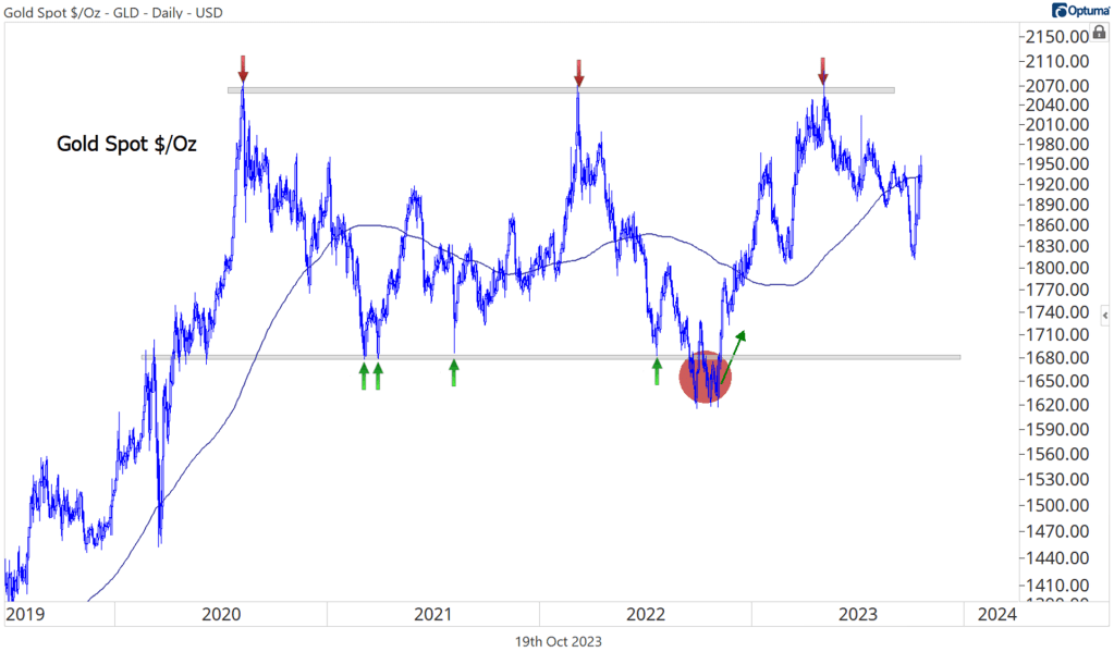 Perhaps if silver can get going, we’ll finally have the catalyst we need for gold to break out from this big, messy trading range. For now, gold prices are near a flat 200-day moving average and lacking an actionable trend.