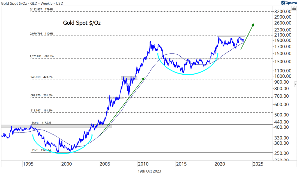 But if that bullish resolution does come? How high could gold go then? We’re eying $3200. That’s the 1794% Fibonacci retracement from the 1990s decline. Prices have respected these retracement levels all the way up: The hiccups in 2006 and 2008 occurred near Fib levels, the ceiling from 2013-2019 was the 684.4% retracement, and right now, were stuck below the 1109% retracement. It would make a lot of sense to go up and touch the next one. $3200 might even be a conservative expectation – prices rallied a lot more after the 2004 breakout.