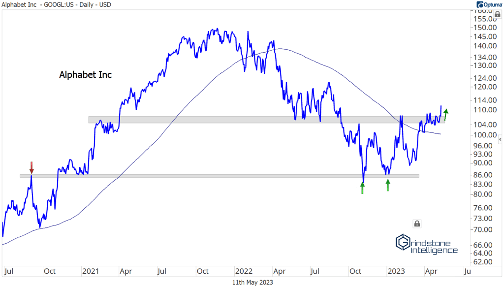 The sector’s largest component, Alphabet, took some time to absorb overhead supply as well. Last fall, GOOGL found support at the September 2020 highs (which we’ve covered extensively in these letters as a significant turning point for Growth vs. Value). That was the ceiling since last fall’s breakdown and we pointed to that resistance as a big reason to take a wait and see approach on the sector. We waited. Now we’re seeing. GOOGL broke out yesterday. We like it long above $110 with a target back at the former highs near $150.