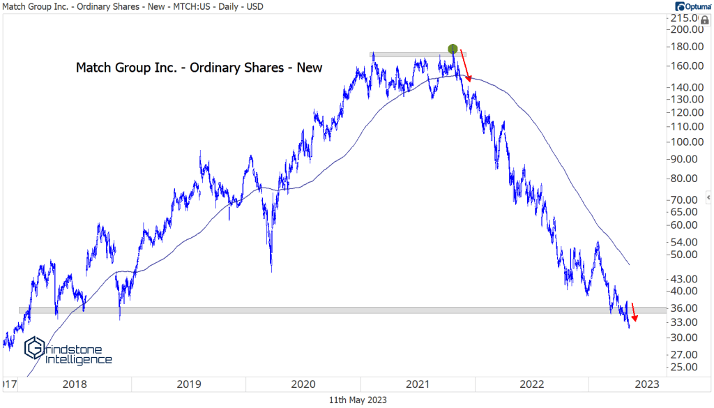 The same goes for Match Group. Since that failed breakout back in 2021, the stock has dropped more than 80%. Now it’s at 5 year lows. Is it possible that we get another failed move here, spurring a bearish to bullish trend reversal? Absolutely. Is that the higher probability outcome? No. Match Group isn’t ‘due for a hit’ just because they’ve struck out 12 times in a row.