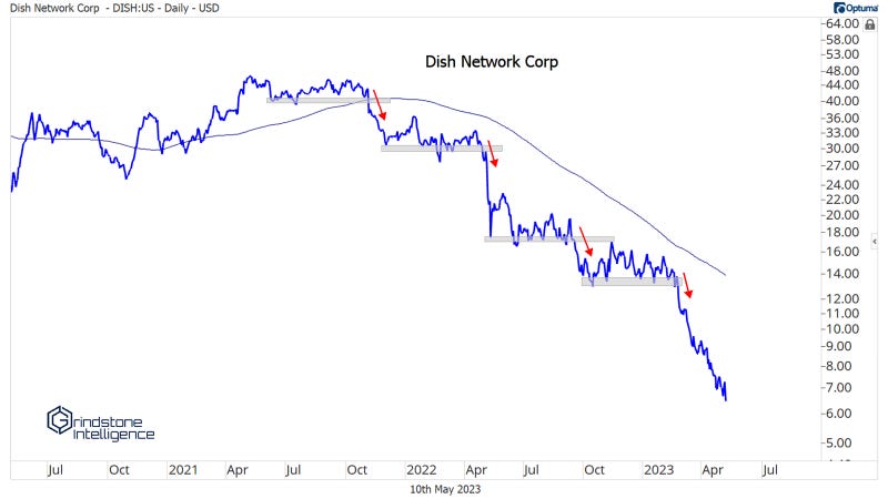 Speaking of freight trains, how about Dish Network? Maybe freight train is the wrong term. Falling knife? Waterfall? Dumpster fire? Whatever you won’t to call it, it’s not something we want to be buying when the rest of the sector is breaking out to new highs.