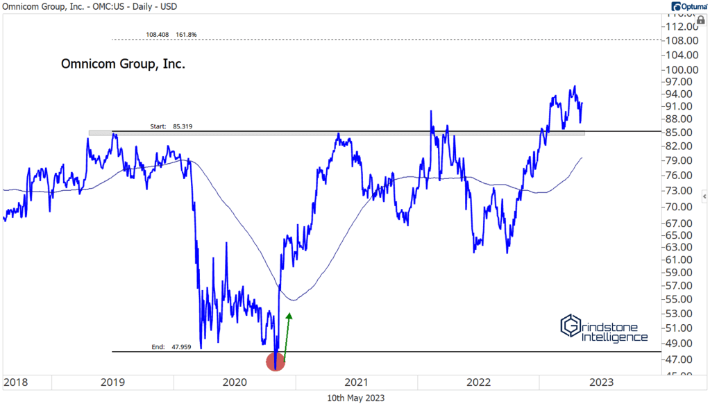 Omnicom is one that’s already near all-time highs. It’s pulled back toward our $85 risk level that we first laid out in our February note, giving us another entry opportunity. We still like it long with a target of $108.