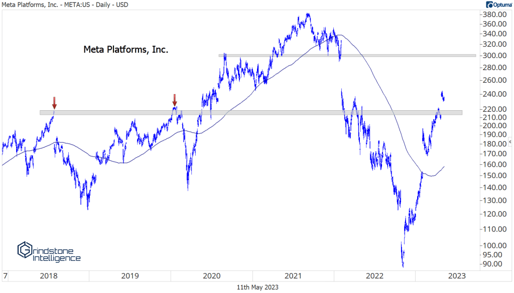 Meta has been the juggernaut of the sector. It blew right past the resistance level that we pointed out last month. Can Meta keep up this torrid pace? Probably not. Do we want to be standing in front of a freight train? Definitely not. We’ll be looking to get long Meta on any pullbacks to $220 with a target near $300. We need to be a bit wary, though, given the stock’s history of big gaps. The story and risk could change rather quickly.