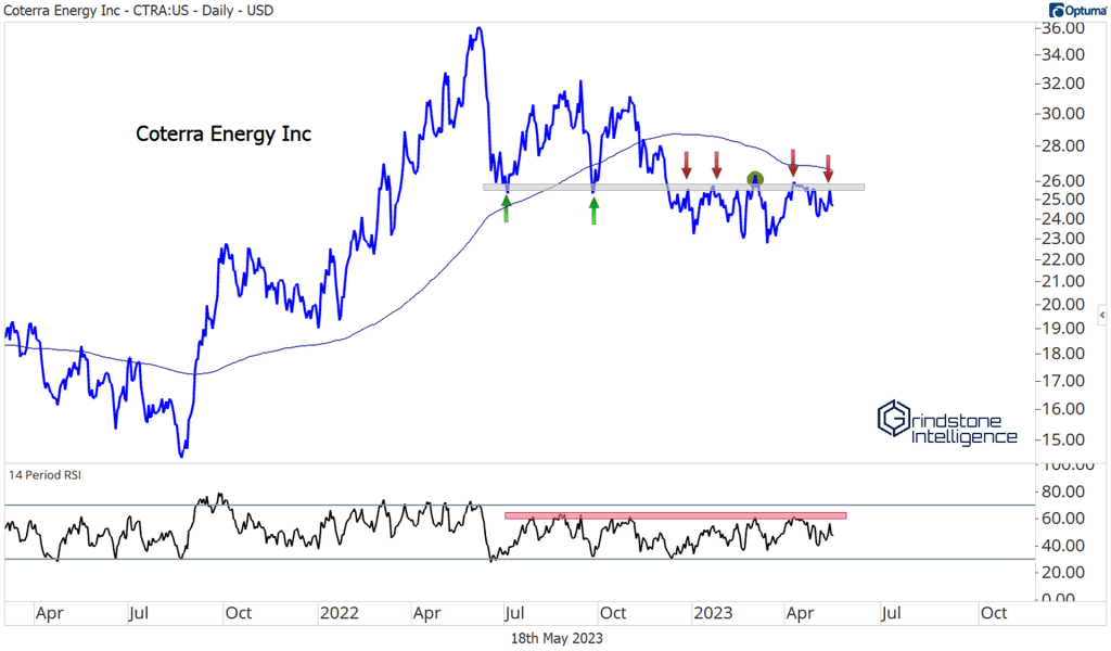 Coterra remains a name that we can look at from the short side (though we’d prefer to just avoid the space altogether and focus on relative strength). It’s below a falling 200-day moving average and stuck below overhead supply from a couple of swing lows in 2022. Momentum is stuck in a bearish range as well. If CTRA is below $25, we’re targeting the year-to-date lows, and that could be just the start.