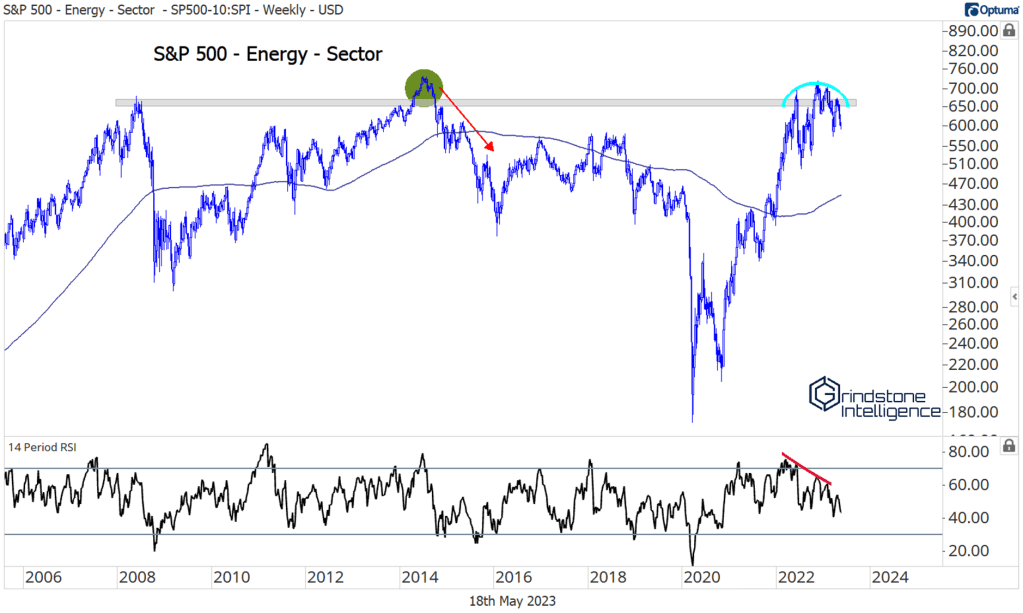 We haven’t forgotten how strong Energy was in 2021 and 2022. In the early days of these publications, the sector was our favorite overweight. But we became concerned late last year because of weekly bearish momentum divergences on both the absolute and relative charts. Compared to the S&P 500, we saw a bullish divergence in 2020 spark the two-year rally. We were wary of another reversal this time around. With each passing day, our concerns have been validated.