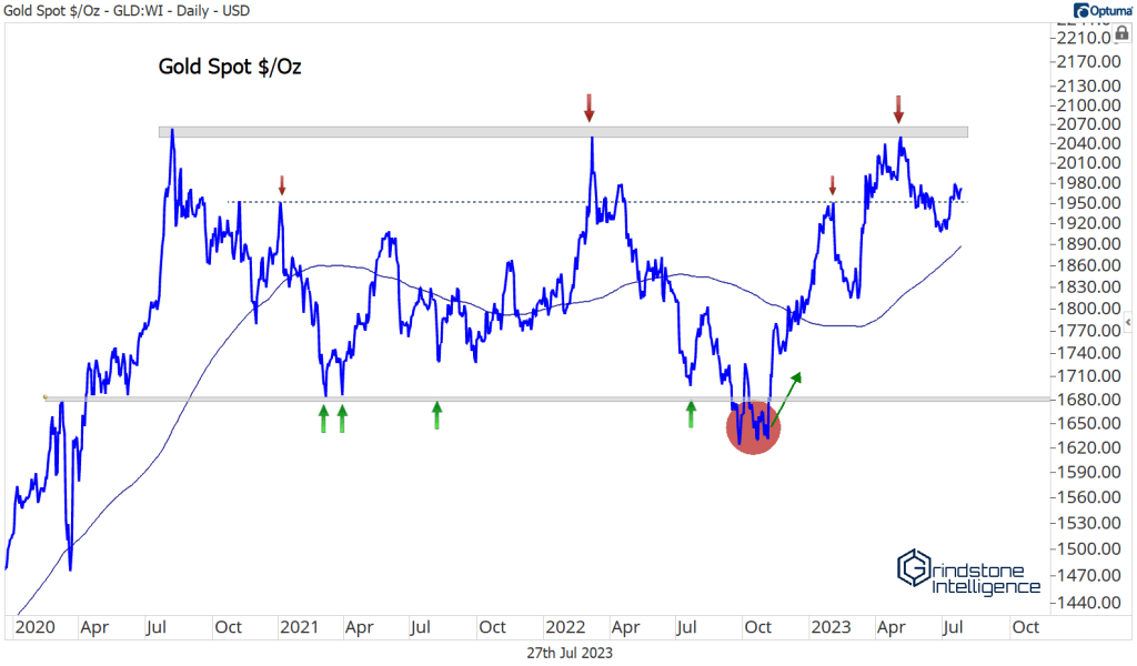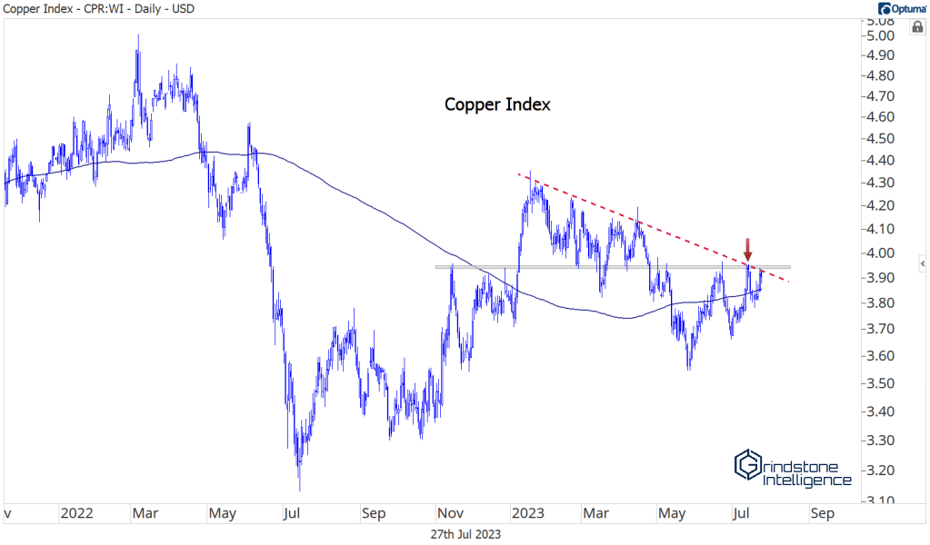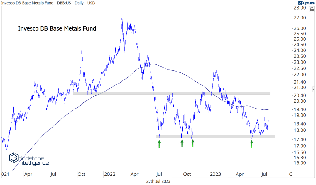 While precious metals work on resolving higher, base metals are just trying not to set new lows. For now, they’re doing a good job of that. Check out the Invesco DB Base Metals Fund bouncing off the former lows again this summer: