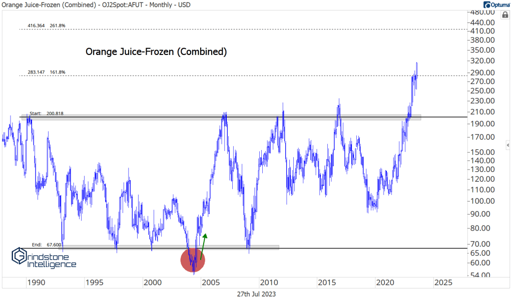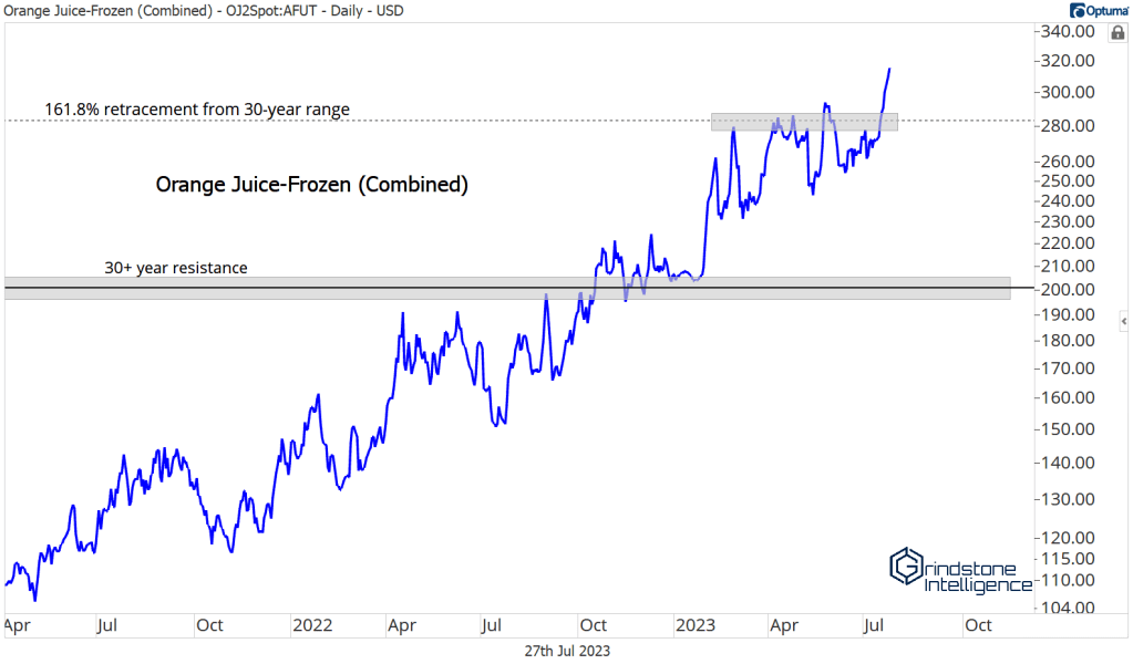 Last time we checked in on OJ was in May, when we noted that it had reached the 161.8% retracement from a 30-year range. We surmised that prices would likely stall out at that level, and our suspicions were confirmed as OJ did nothing for the next few months. Now, that consolidation has resolved higher: