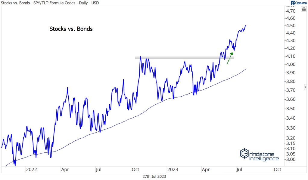 The Peso is telling us that this is a risk-on environment. Stock prices have been telling us that for awhile, too, and not just on an absolute basis. Stocks have been ripping higher vs. bonds.