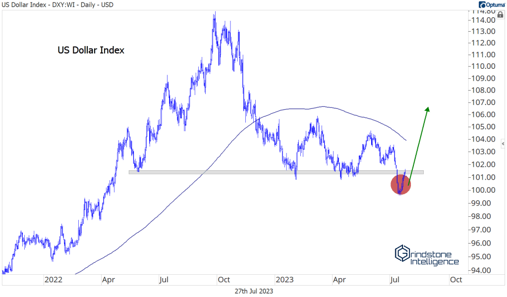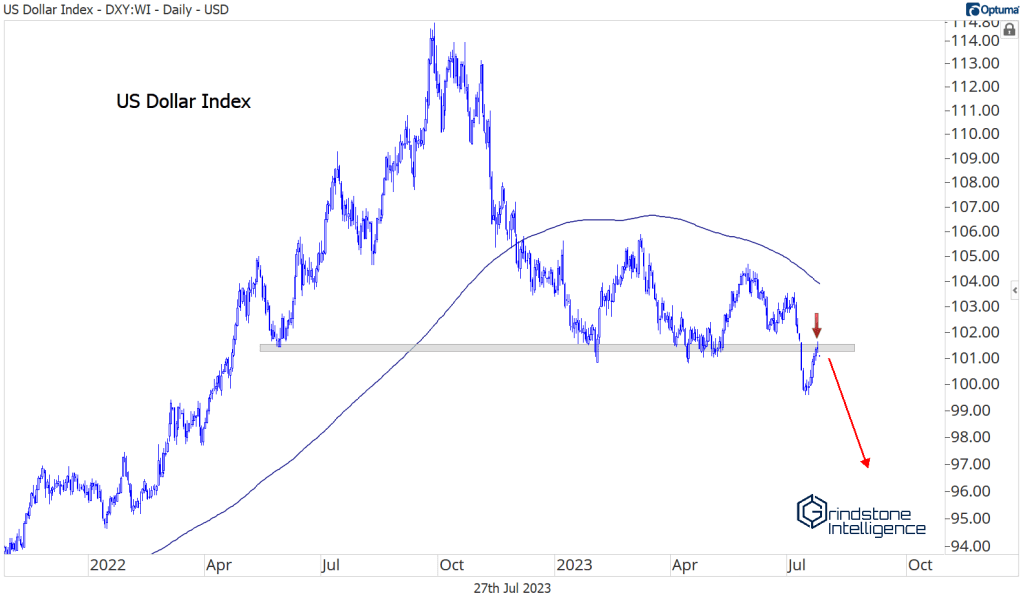 The US Dollar Index is at a make-or-break level, in our opinion. After falling to new 52-week lows earlier this month, the index has rallied back to the initial breakdown level.