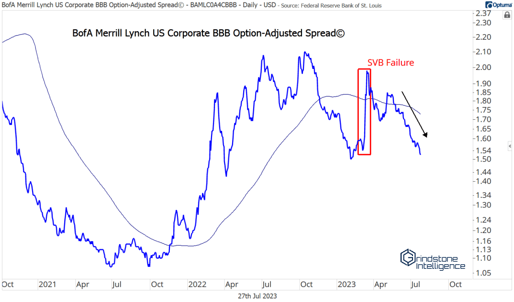 And credit spreads are nearing 1-year lows. We’ve all but erased the post-SVB spike. Again, would credit spreads be drifting toward lows if investors were trying to avoid risk?