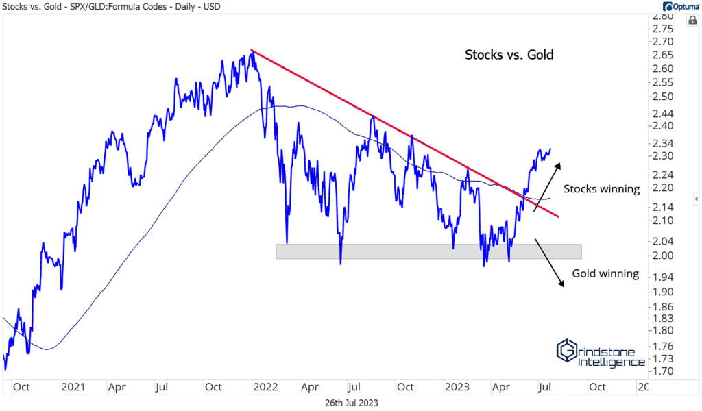Timeframes are important here. Since the S&P 500 peaked in January 2022, gold has still been the better bet. The recent trend has clearly shifted in favor of equities, though. The stocks vs. gold ratio has broken the downtrend line from the peak and is further above the 200-day moving average than at any time over the last 18 months. That’s a stark shift from April, when it looked like the ratio was set to resolve lower.