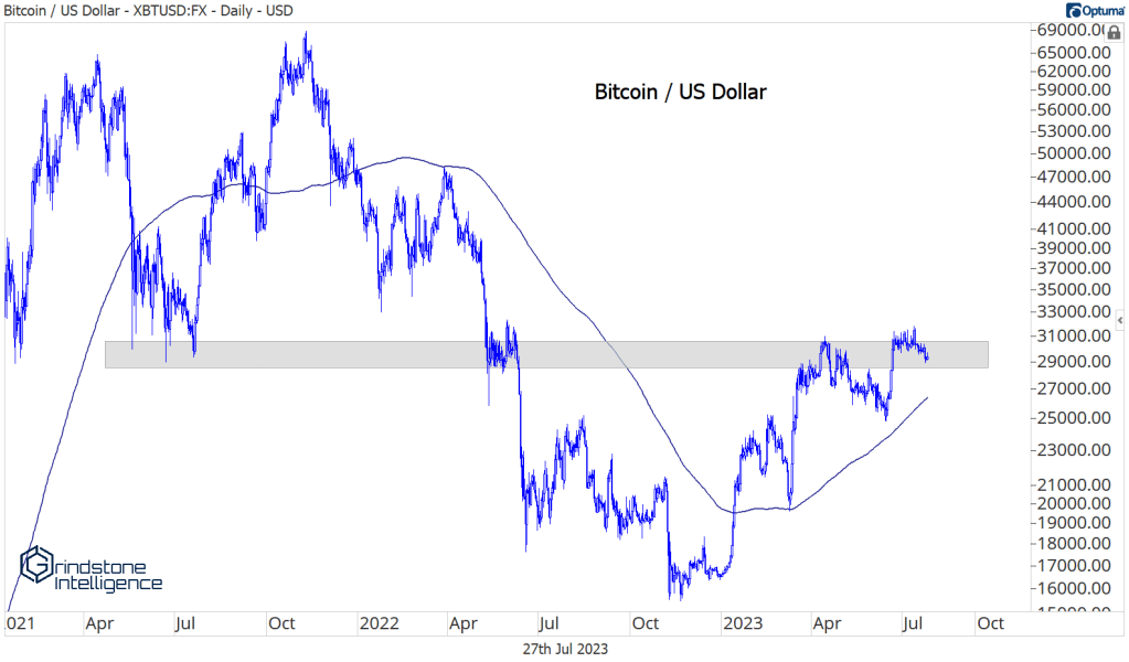 Bitcoin still hasn’t been able to absorb all this overhead supply from the summer 2021 lows. Listen, this isn’t a downtrend. We’re setting higher highs and higher lows. Price is above a rising 200-day. The uptrend line from the lows is intact. So we don’t see much reason to short Bitcoin. But we also have no reason to be long until we can break out above this key resistance level. When/if it does, the risk/reward will be heavily skewed in our favor, and we’ll be targeting short-term move above $40,000. Right now, the best course of action is to just leave it alone.
