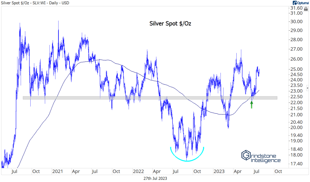 On its own, silver continues to hold up. There’s plenty of overhead supply to absorb, and the word ‘messy’ comes to mind when you see all the chop we’ve been dealing with for the past few years. Be that as it may, though, silver is above a rising 200-day moving average, and it has been since March. The one thing we know is that it’s not in a downtrend.