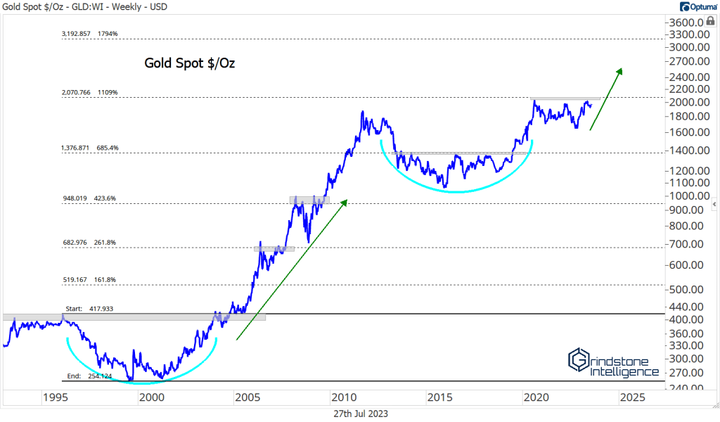 Things could shift back in favor of the yellow metal if it breaks out of this big consolidation range. Each time buyers push prices up toward $2070, they absorb more overhead supply. At some point, there won’t be any sellers left. How high could the metal go on a breakout above $2070? We’re eying $3200. That’s the 1794% Fibonacci retracement from the 1990s decline. Prices have respected these retracement levels all the way up: The hiccups in 2006 and 2008 occurred near Fib levels, the ceiling from 2013-2019 was the 684.4% retracement, and right now, were stuck below the 1109% retracement. It would make a lot of sense to go up and touch the next one. $3200 might even be a conservative expectation – prices rallied a lot more after the 2004 breakout.