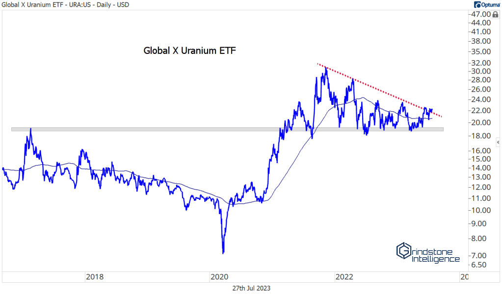 Uranium is one of the best setups in the entire commodities space. URA has been consolidating above support for 2 years after it completed a long-term bearish-to-bullish reversal in 2020. Our risk here is very clearly defined for URA: we don’t want to own it if it drops below 18. But if we’re above that, we think URA can go back to the 2021 highs at 31. Longer-term, it could go much higher.