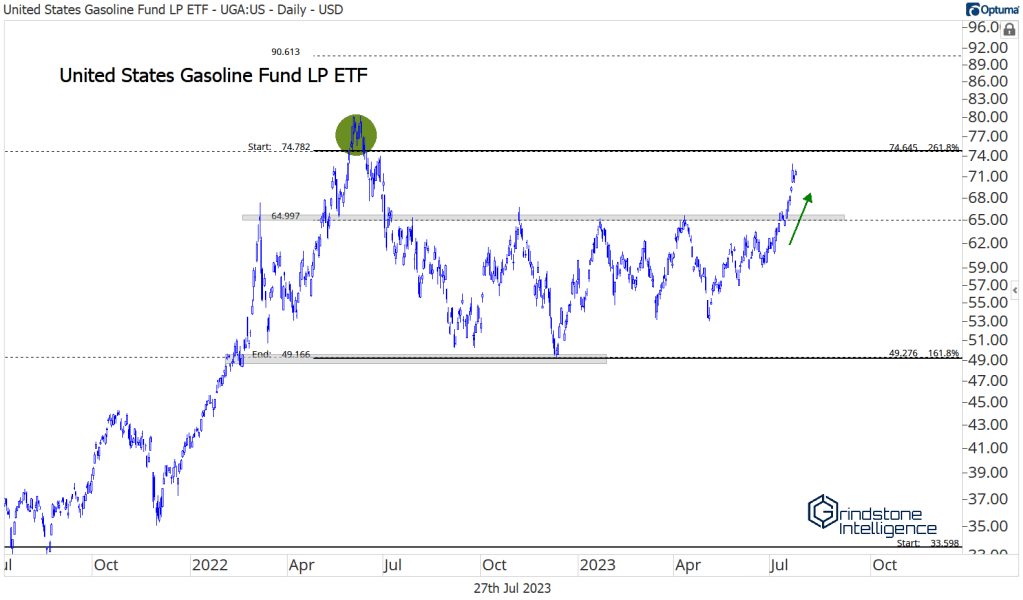 But we’re seeing relative strength elsewhere in the energy space. Gasoline (UGA) is at new 52-week highs after breaking out above stiff resistance that had been in place since last fall.